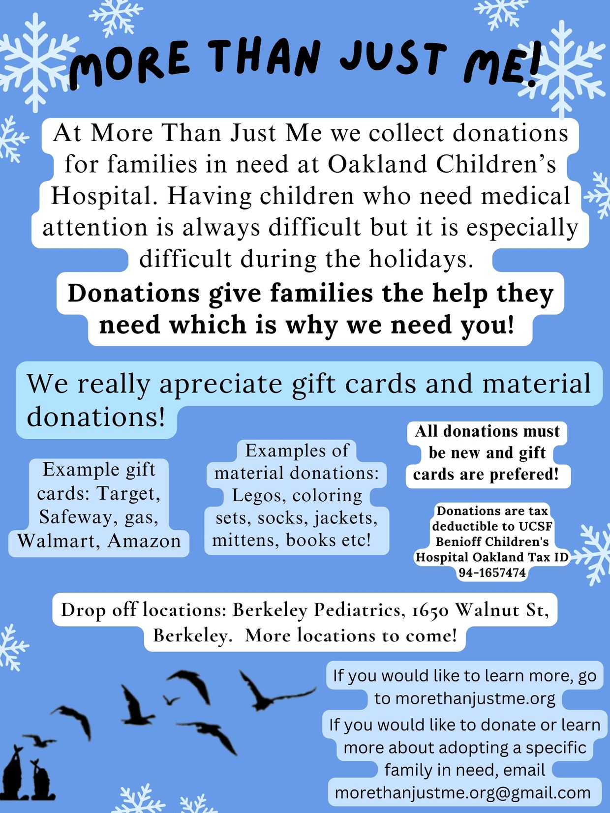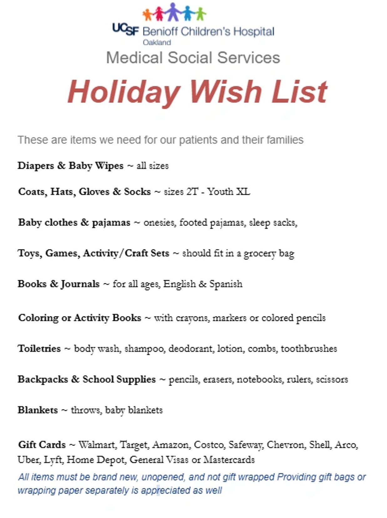 We are a student run organization connecting local businesses and community members to the social workers at UCSF Benioff Children's Hospital Oakland. Our goal is to support families in need who have a child being cared for at Children’s Hospital.